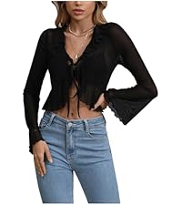 Sheer Mesh Bell Ruffle Top Mock Neck Solid T Shirt Long Sleeve Collar Blouses Sheer V Neck T Shirt Square Neck Ruched Blouse Tops Mock Neck Long Sleeve Tee Ruffle Large Doll Collar Shirt